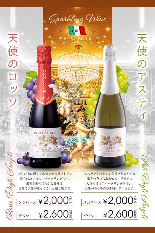 マスカットの華やかな香りと爽やかな果実味を持ちあわせる、世界的に人気の甘口スパークリングワイン。ワインとともに、天使が幸せや喜びを届けてくれます。